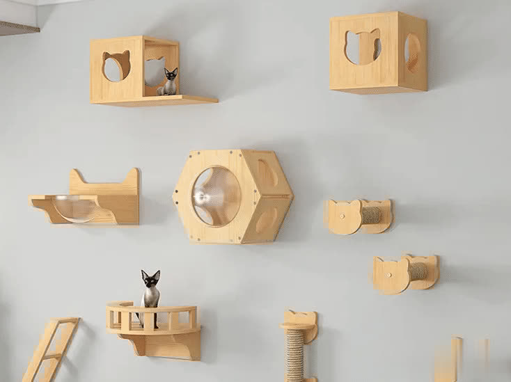 猫可以放在高台或者是定制柜的角落,或者在承重墙上直接做隔板式猫爬架。将步行道跳板和转梯组合在一起,既能够要喵星人自由地蹦跶,还能够区分了人与宠物的活动空间。