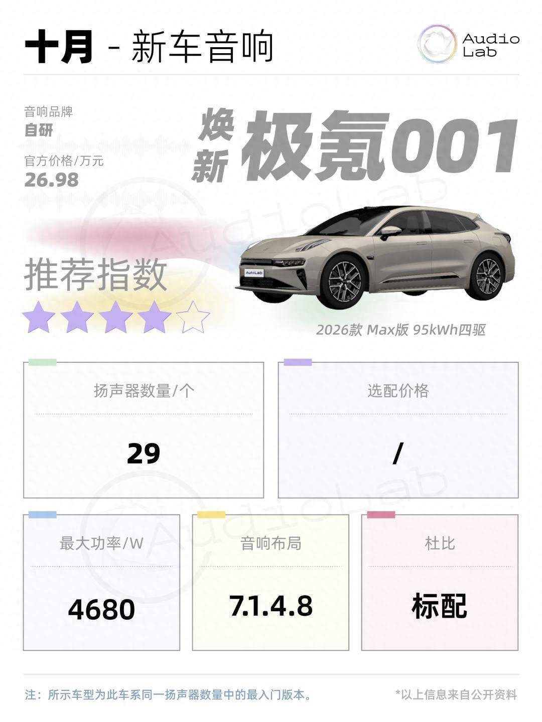 我们也汇总了一期音响新车周报,为了能让大家更直观地感受,我们这一次依然从硬件基础、系统功能、整车价格及选装费、音源生态、以及创新性多个维度进行了主观的综合评分。